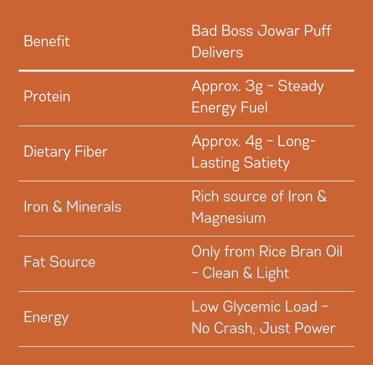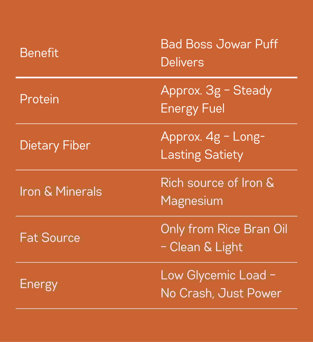Bad Boss Jowar Puffs are a no-compromise upgrade: bold in flavor, ruthless on nutrition, and built for sustained energy.